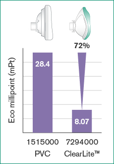 L'exemple suivant illustre la réduction de l’impact environnemental entre un masque facial d’anesthésie classique en PVC vs. un masque facial d’anesthésie ClearLite™.